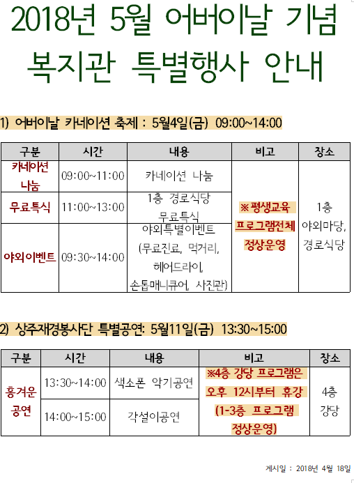 [평생교육] 2018년 5월 어버이날기념 복지관 특별행사 안내
