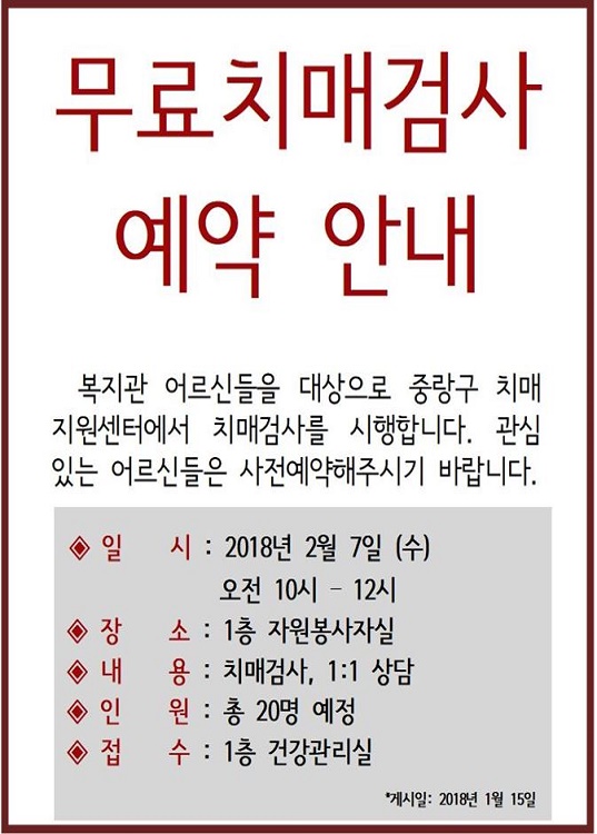 [건강관리실] 중랑구치매지원센터 무료치매검사 안내