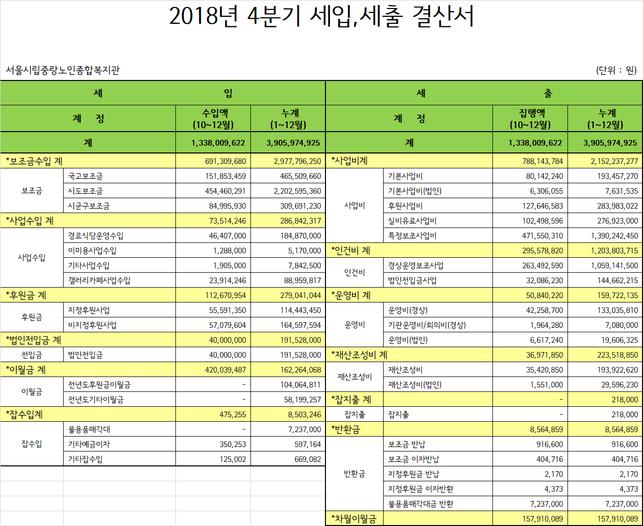 2018년 4분기 세입세출 결산보고(복지관) 박은정 0 230 2019.01.04 08:59 2024.07.17 06:27 2018. 4분기 결산서(복지관) - 공개용.pdf (39.9K) + 0