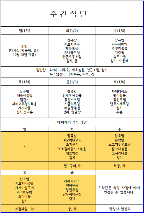 중랑데이케어센터 2024년 1월 1주차 식단사진 공지