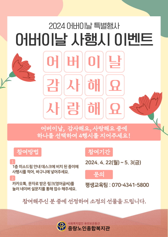 어버이날을 기념하며, 사랑과 감사의 마음을 가족에게 전해보세요. 많은 관심과 참여부탁드립니다!