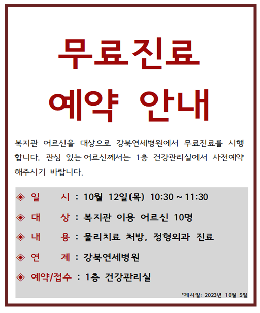 [건강관리실] 강북연세병원 무료진료 예약 안내