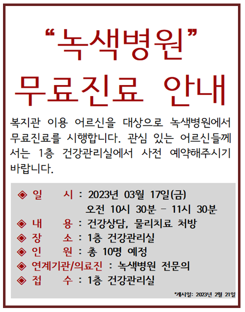 [건강관리실] 녹색병원 무료진료 예약 안내