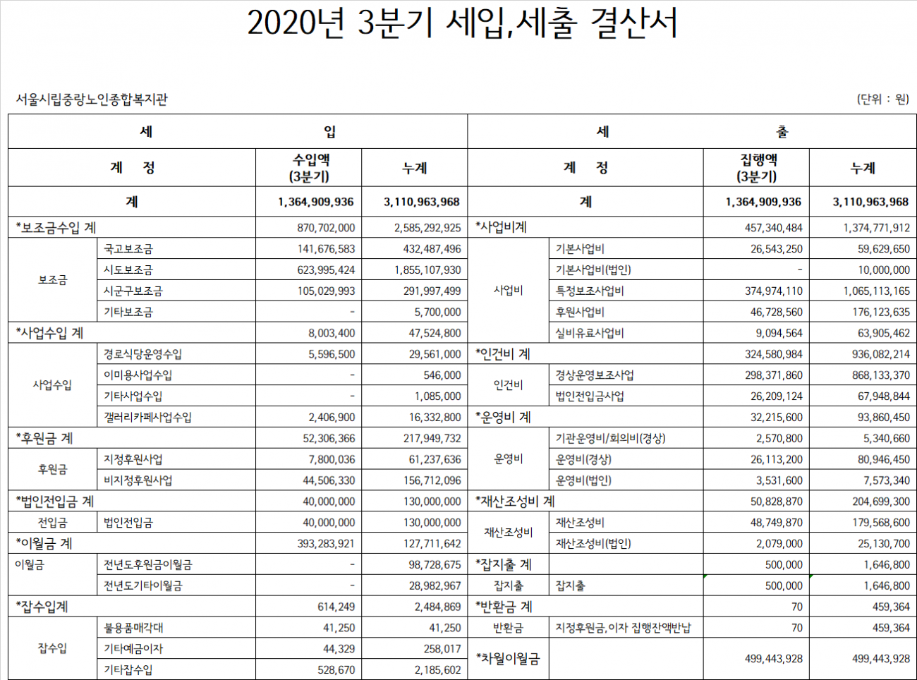 2020년 3분기 세입세출 결산보고(복지관) 박은정 0 259 2020.10.08 16:27 2024.07.17 06:27 2020.3분기 결산서(복지관)-공개용.xlsx (77.1K) + 0