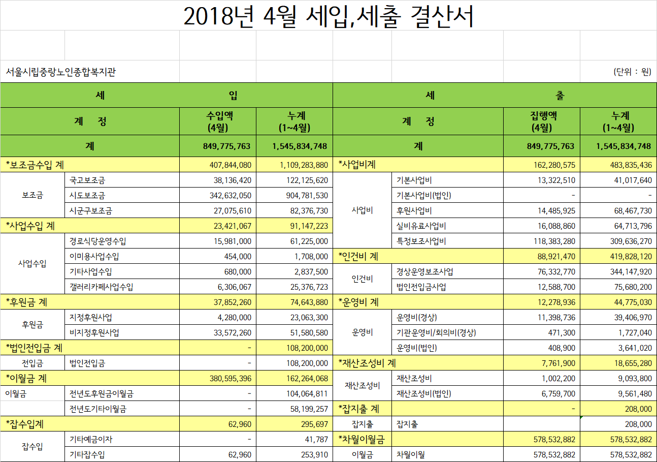 2018년 4월 세입세출 결산서(복지관) 박은정 0 305 2018.05.09 15:26 2024.07.17 06:27 2018.4월 결산서(복지관)-공개용.xlsx (26.2K) + 0