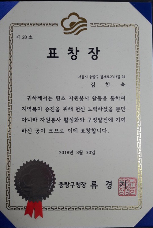 [표창] 김미화,김한숙 자원봉사자 중랑구청장 표창