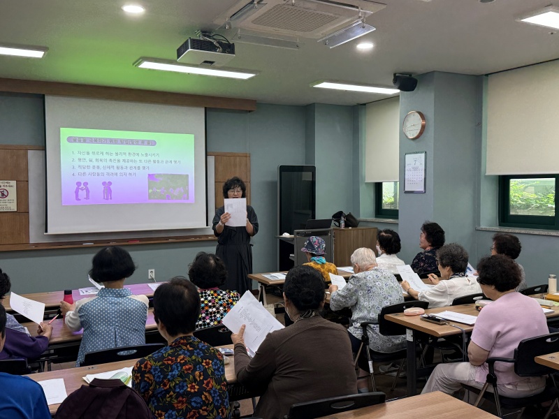 전문기관(각당복지재단 등)에 연계하여 죽음에 대한 부정적인 태도와 불안감을 낮추고, 자아통합감을 높이기 위한 강의를 제공합니다.