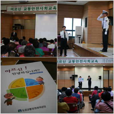날씨가 너무도 화창한 4월 23일(목) 오후 3시반에 어르신들이 강당에 웅성웅성~어르신 교통안전교육이 진행되고 있네요