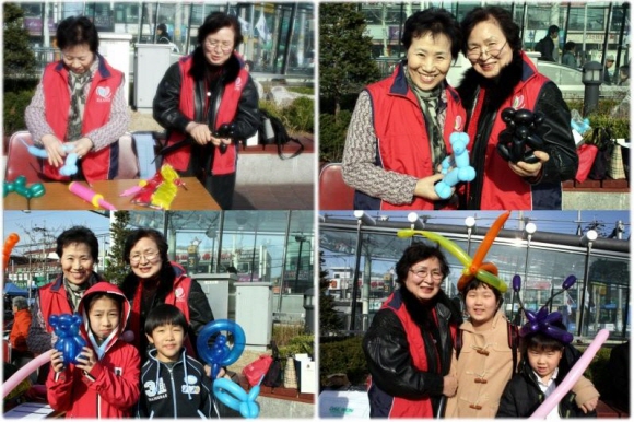 요술풍선으로 곰돌이, 칼, 강아지 등의 여러가지 모양을 뚝딱 만드시는 어르신들의 모습에 지나가는 주민들이 가던 길을 멈추고 캠페인에 관심을 보여주셨습니다.