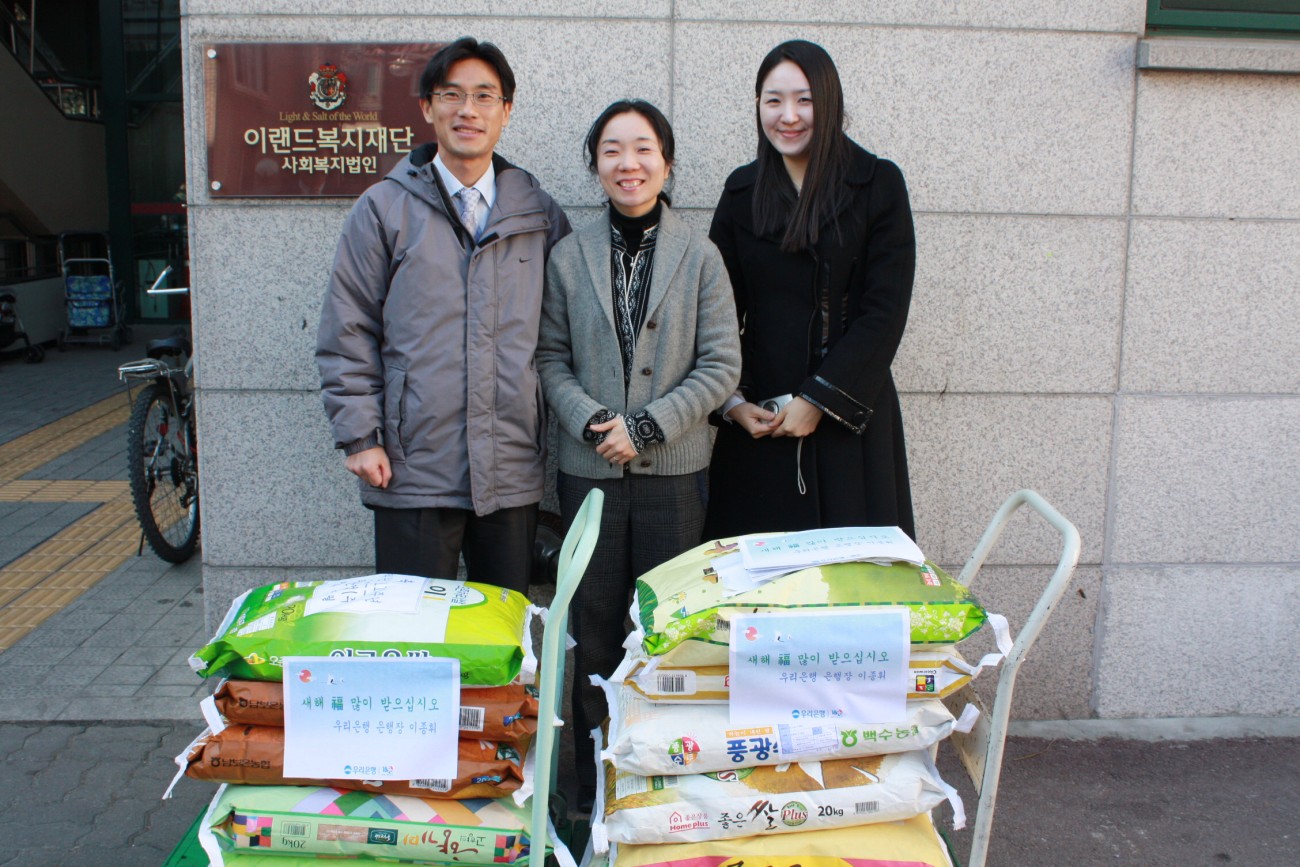 우리은행과 함께한 행복한 쌀 나눔 박태환 0 510 2009.01.16 10:40 1월 16일 복지관 앞마당에서 쌀을 한가득 실은 차량이 도착하였습니다. 그건 우리복지관 독거어르신들을 위해 추운날씨에도 불구하고 아침부터 힘차게 달려온 우리은행과의 행복한 쌀 나눔 전달식이 있었습니다. 이번 나눔으로 인해 설날을 맞이하여 경제적으로 어려움이 있고 홀로 지내시는 어르신들을 위하는 우 리은행의 아름다운 사랑 나눔으로 우리 어르신들이 따뜻하고 행복한 설날을 보내실 것입니다. 행복나눔에 동참해 주신 우리은행 관계자 여러분에게 깊은 감사의 말씀을 드립니다.