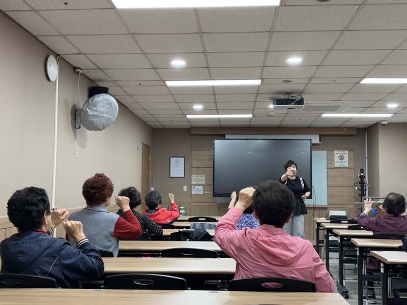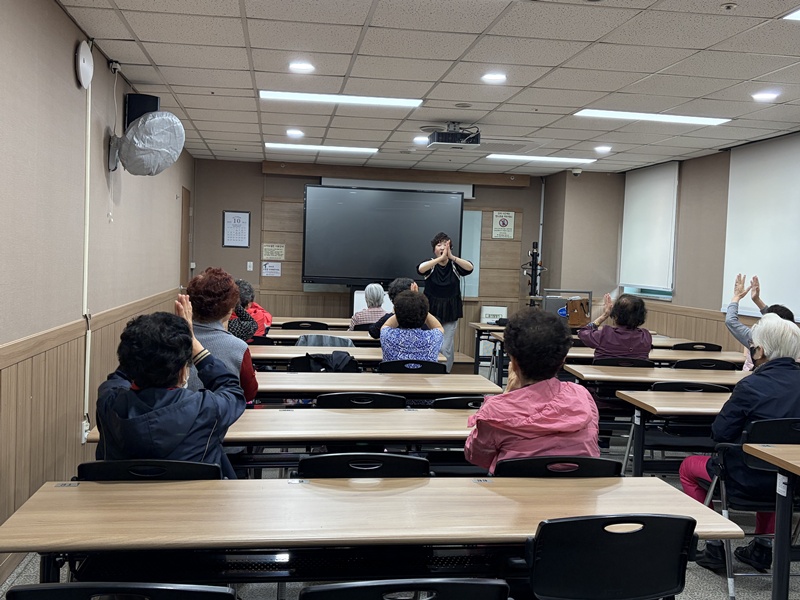 오늘은 ‘우울예방 프로그램 – 웃음치료’를 주제로, 참여자들은 노래에 맞춰 맨몸 체조를 진행하며 신체를 자연스럽게 움직이고 웃음을 유도하였습니다. 이어 손가락 운동과 간단한 리듬 활동을 통해 집중력과